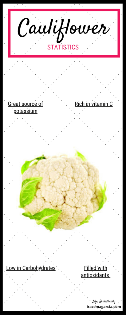 Not only is it one nutrient-rich, tasty veggie, it is also rich in several antioxidants, which aid in the reduction of inflammation. It is also a good source of fiber, helping you feel fuller longer. Not to mention, its full of choline which helps with brain function. It is low in carbohydrates making it very popular with nutrition-conscious individuals looking to reduce their over-consumption of carbohydrates. Cauliflower has found popularity among individuals seeking a more whole foods diet often replacing it for processed grains to replicate grain-based dishes.