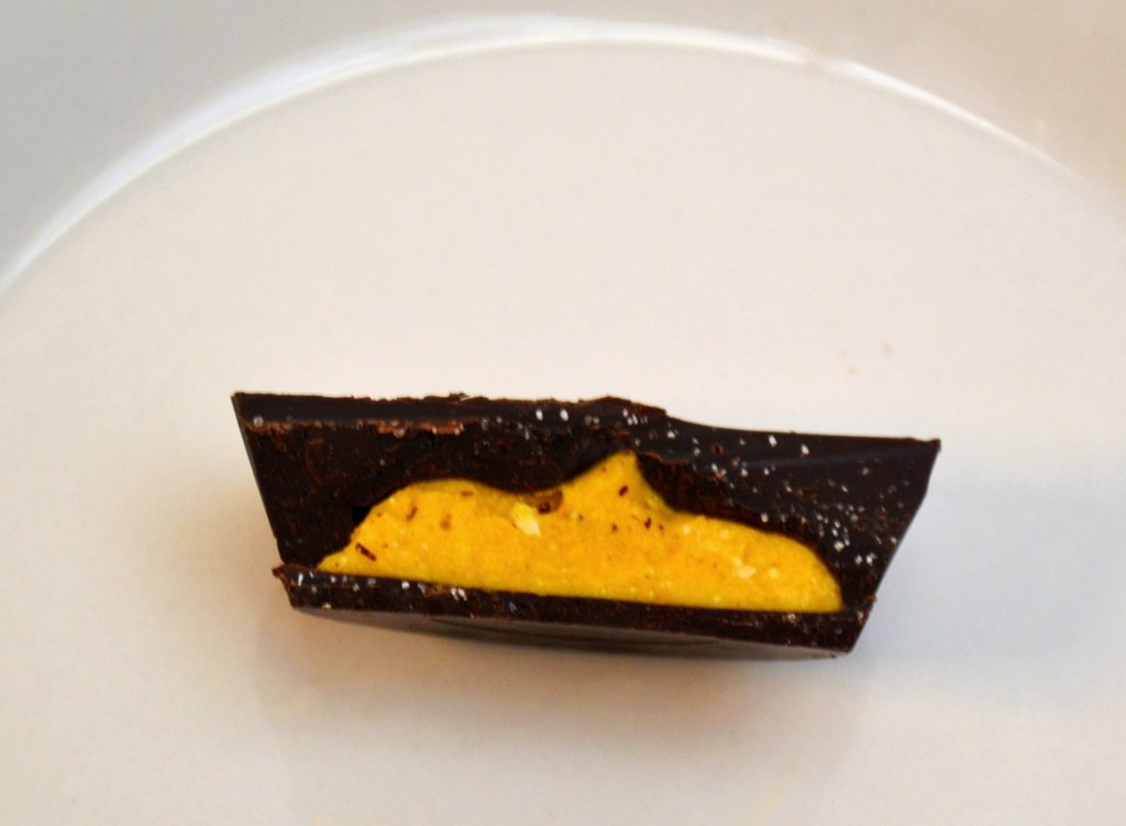 Set tin back in freezer for about 20 minutes or until pumpkin mixture is firm. Remove from freezer.  Spoon chocolate on top of pumpkin mixture (note: the temperature of the pumpkin will harden the chocolate fairly quickly) making sure to completely coat the pumpkin mixture. Set back in freezer for at least another 10 minutes or until chocolate has hardened.Â